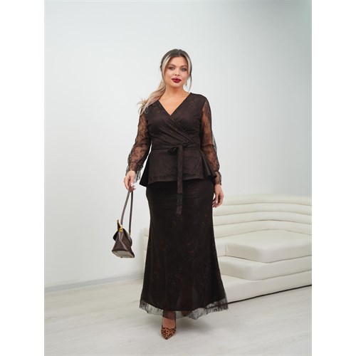 Кофта с кружевными рукавами и баской элегантно подчеркивает талию, а юбка силуэта рыбка, украшенная кружевным краем, придаёт легкость и изящество образу.