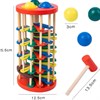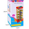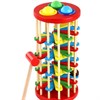 Забавная игрушка-стучалка представляет собой наклонную винтовую лесенку, по которой с треском скатываются шарики. Для проталкивания шариков внутрь стучалки прилагается специальный молоточек. Игрушка сделана из дерева, окрашенного в яркие цвета стойкими, нетоксичными красителями.