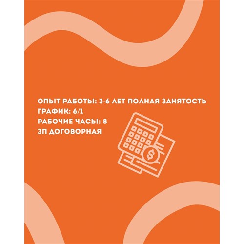 ОПЫТ РАБОТЫ: 3-6 ЛЕТ ПОЛНАЯ ЗАНЯТОСТЬ 💻 ГРАФИК: 6/1 🗓️ РАБОЧИЕ ЧАСЫ: 8 🕐 ЗП: ДОГОВОРНАЯ 💵